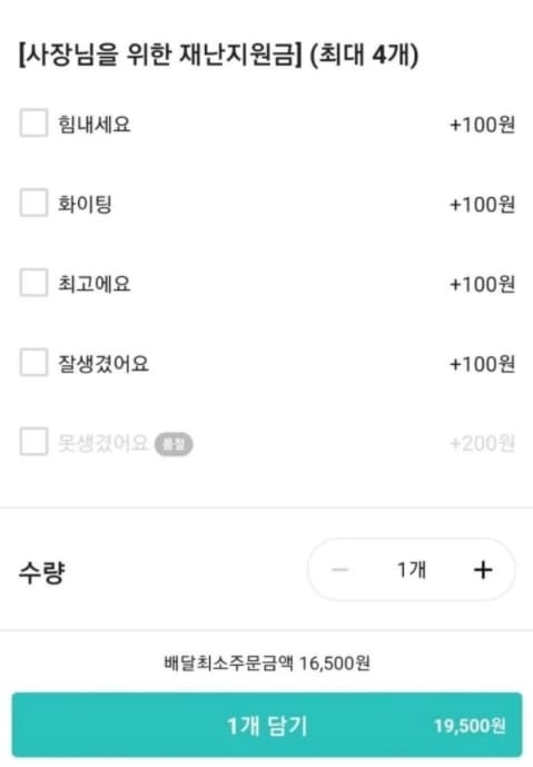 해당 글에는 ‘사장님을 위한 재난지원금’이라는 메뉴가 있는 ‘배달의 민족’ 캡처 사진이 첨부되어있었으며 해당 메뉴에는 ‘힘내세요’, ‘화이팅’, ‘최고예요’, ‘못생겼어요’가 존재했다.