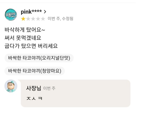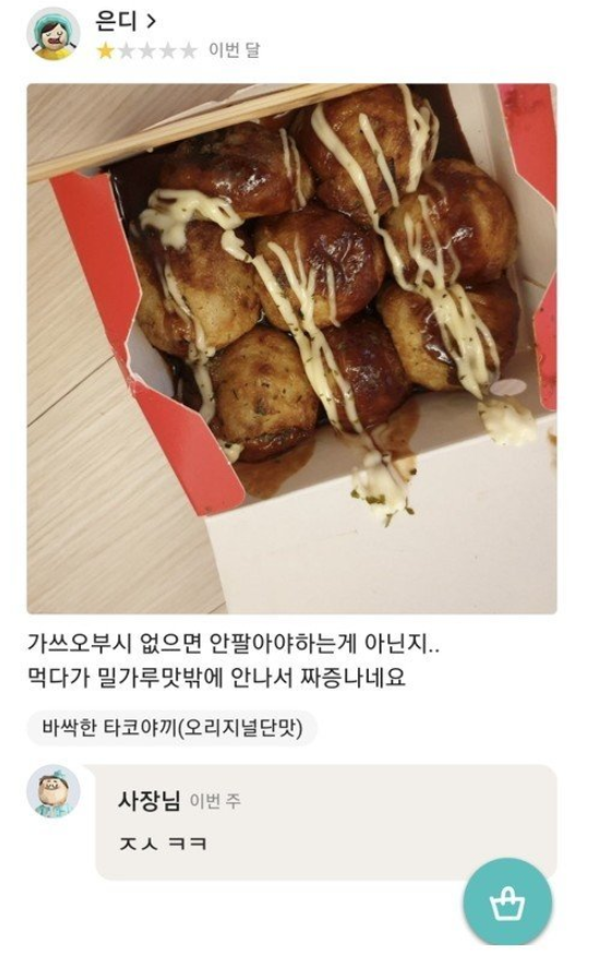 어느 소비자는 “이건 너무 심하네요. 다코야끼가 아니라 빈대떡같습니다. 미리 만들어 둔 거 아닌가요?”라고 묻자 이에 사장은 “ㄴㄴㄴㅈㅅㅋ”라고 답변해 논란이 되고 있다.