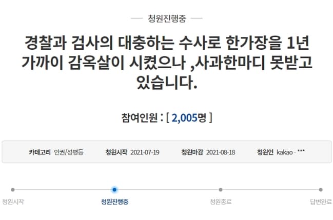 과거 청와대 국민청원에는 ‘경찰과 검사의 대충 하는 수사로 한 가장을 1년 가까이 감옥살이시켰으나, 사과 한마디 못 받고 있습니다’라는 제목의 청원이 올라왔다.