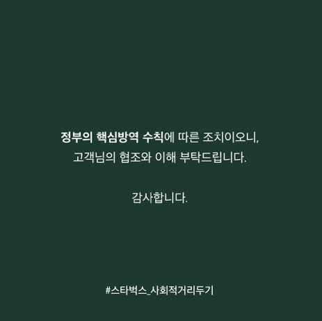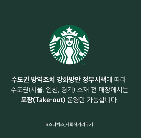 스타벅스는 “수도권 방역조치 강화방안 정부시책에 따라 수도권 소재 전 매장에서는 포장 운영만 가능하다”며 “정부의 핵심방역 수칙에 따른 조치이니 고객님의 협조와 이해 부탁드린다”고 말했다.