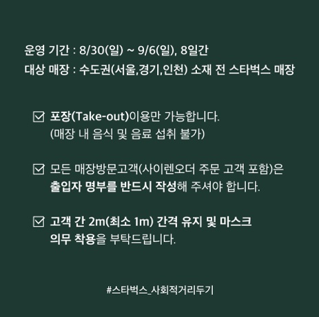 이에 따라 수도권 전 스타벅스 매장에서는 포장 이용만 가능하며, 모든 매장방문고객은 출입자 명부를 반드시 작성해야 한다.