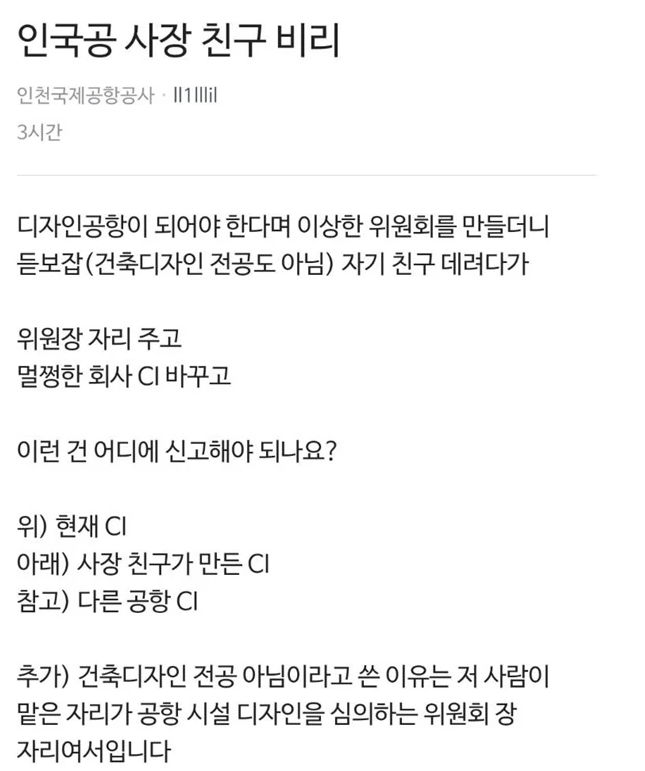 글 작성자는 “디자인 공항이 되어야 한다며 이상한 위원회를 만들더니 듣보잡(건축디자인 전공도 아님) 자기 친구 데려다가 위원장 자리 주고, 멀쩡한 회사 CI 바꿨다. 이런 건 어디에 신고해야 되나요?”라고 주장했다.