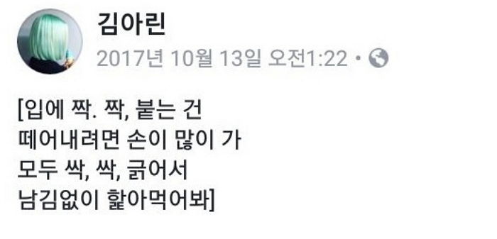 “입에 짝짝 붙는건 뗴어내려면 손이 많이 가. 모두 싹싹 긁어 남김없이 핥아먹어봐”