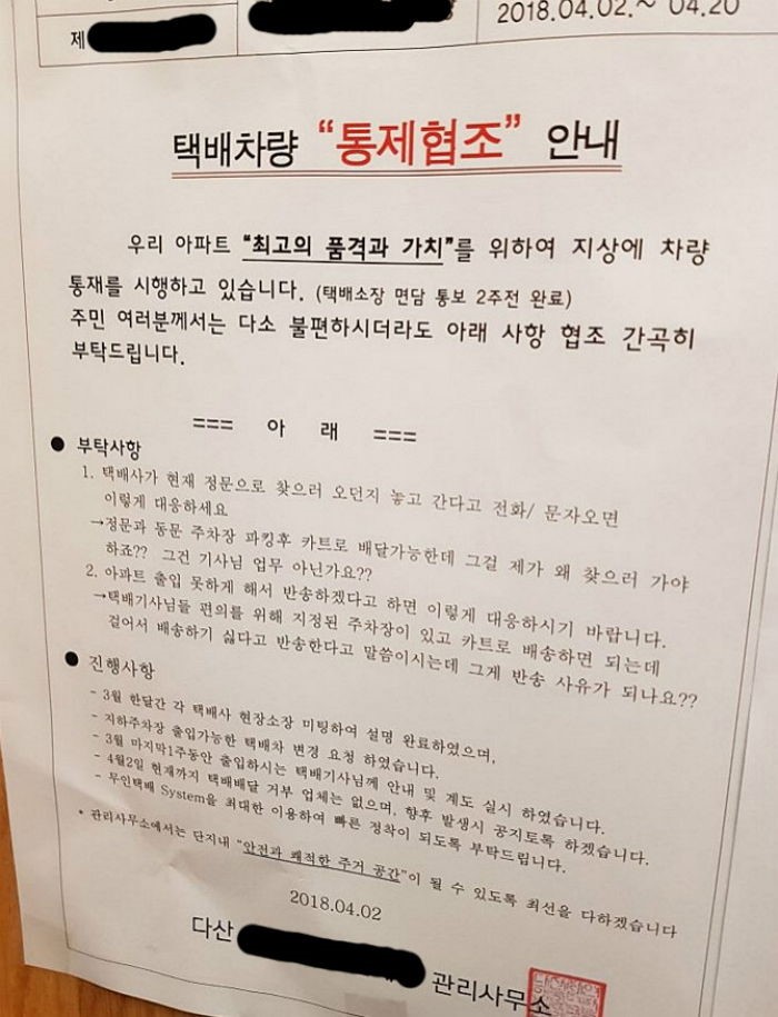 아파트의 품격과 가치를 위해 택배 차량을 통제하겠다고 공문을 올렸던 아파트 근황이 전해졌다.