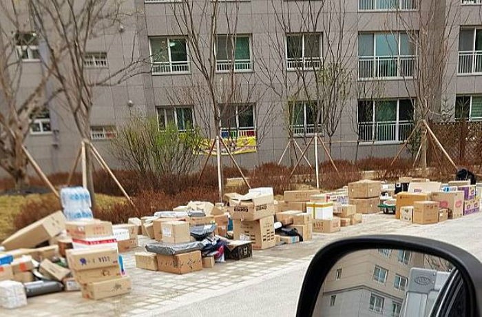 택배기사들이 아파트 입구 길가에 택배 박스를 내려놓고 갔기 때문이다.