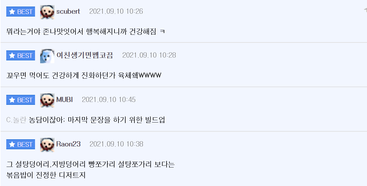이를 본 온라인 커뮤니티 네티즌들은 “볶음밥이 칼로리가 높기는 하지만 정말 맛있기 때문에 먹으면 행복해서 스트레스가 해소되는 기분입니다.”, “저도 볶음밥은 별로 안 먹는 편입니다.”라는 반응을 보였다.
