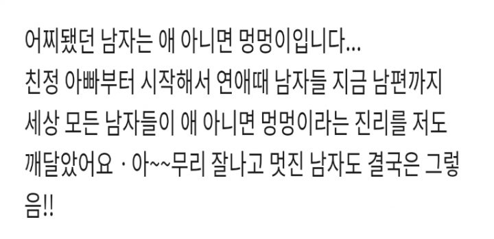 친정 아빠부터 시작해서 연애때 남자들 지금 남편까지 세상 모든 남자들이 애 아니면 멍멍이라는 진리를 저도 깨달았어요