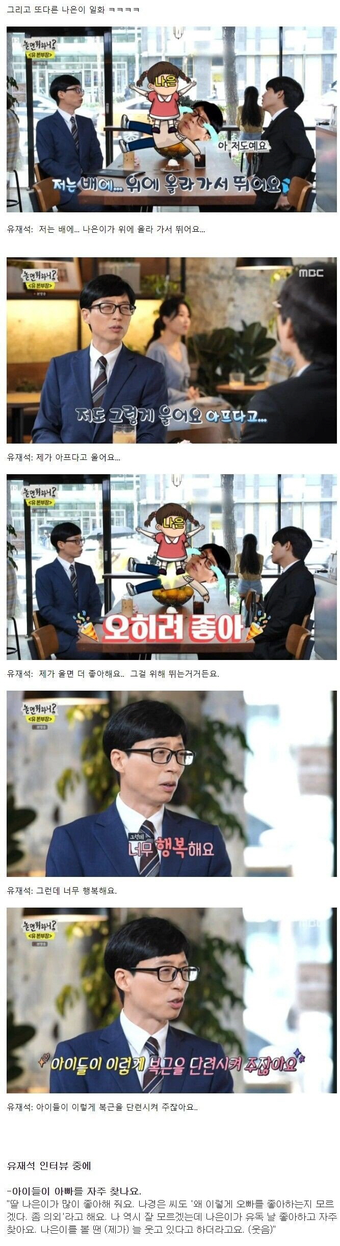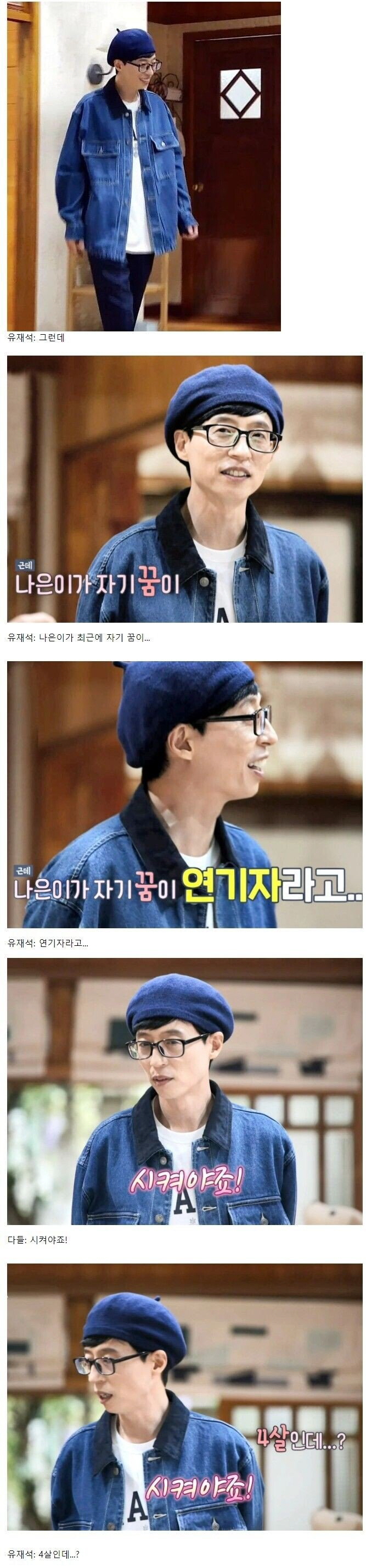 이어서 방송인 유재석은 “딸이 원하는 장래희망이기 때문에 저는 연기자를 시켜주고 싶다.”라고 말을 덧붙였다.