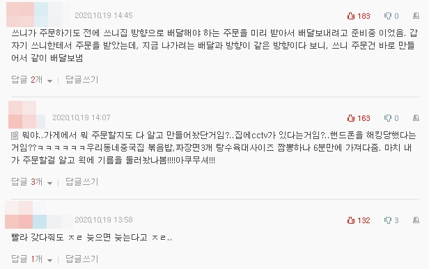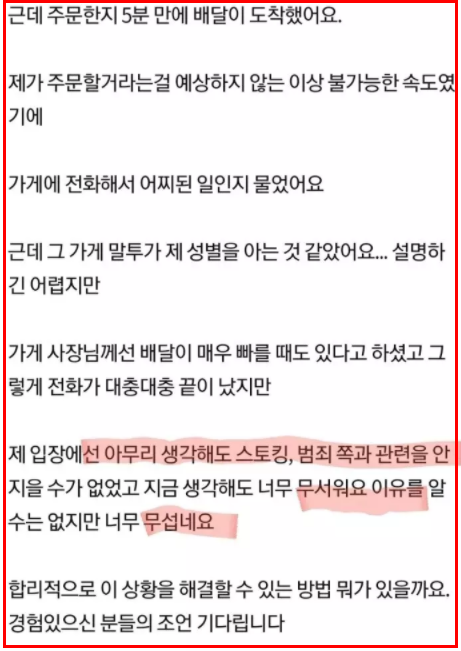 이에 주인은 “배달이 매우 빠를 때도 있다”고 답했으나 작성자는 “설명하기는 어려운데 가게 주인의 말투가 제 성별을 아는 것 같다”고 주장했다.