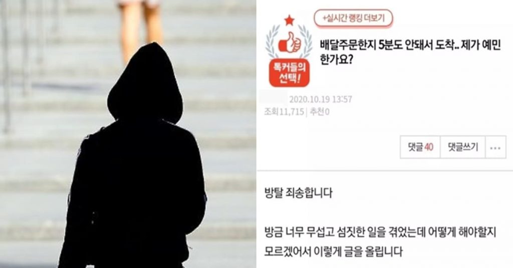 과거 해당 커뮤니티에 “배달 주문한 지 5분도 안돼서 도착.. 제가 예민한가요?”라는 제목의 글이 올라왔다.