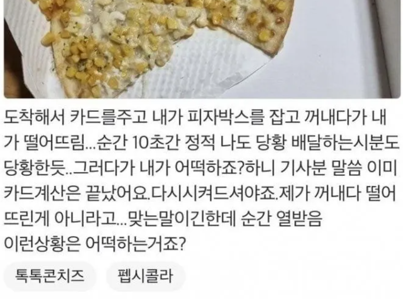 피자를 주문한 손님은 “피자가 막 배달이 와서 제가 계산을 위해 카드를 꺼내고, 피자박스를 잡다가 떨어뜨렸습니다.”라며 이야기를 시작했다.