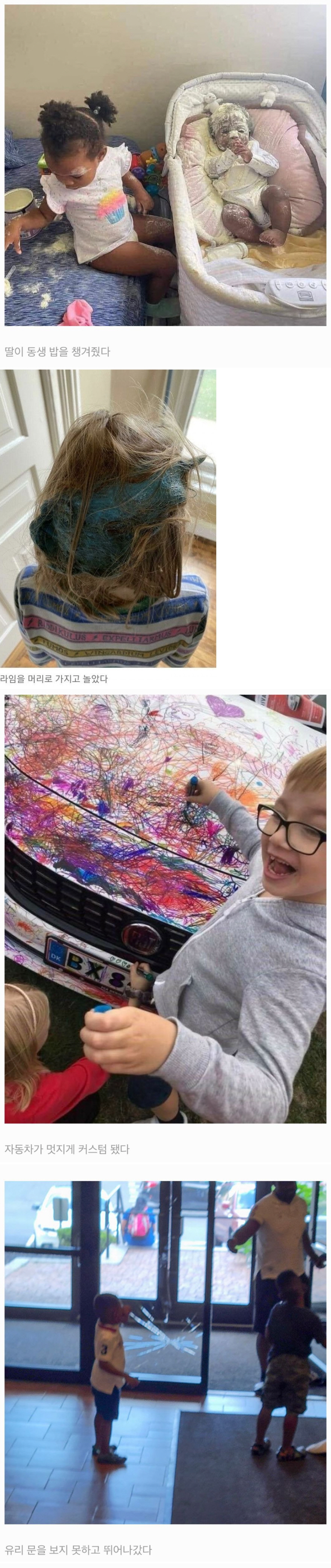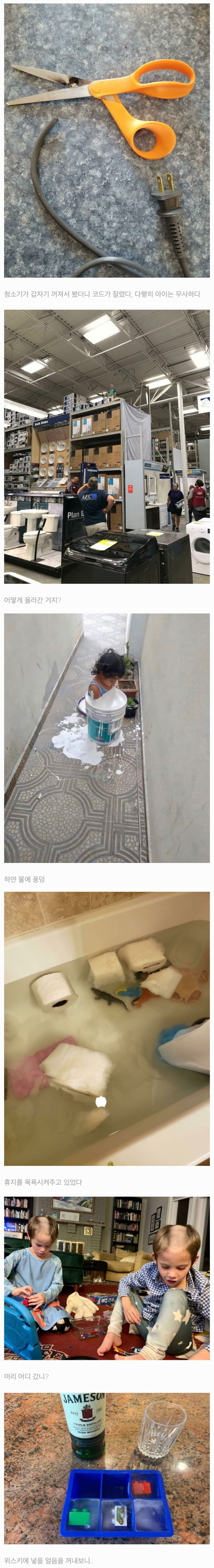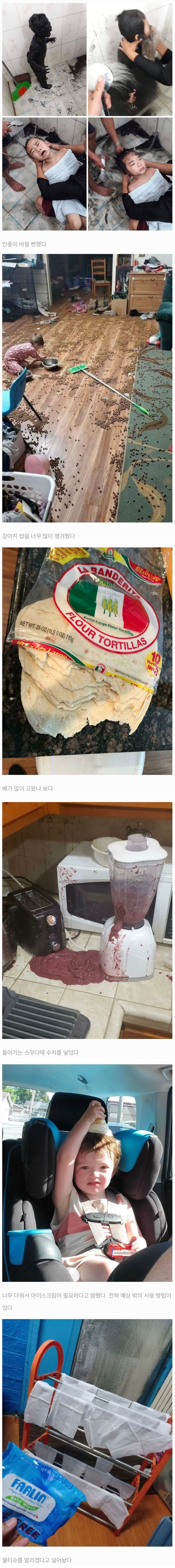 다른 사진에는 먹는 아이스크림을 자신의 머리에 얹은 아이, 강아지 사료를 거실 바닥에 전부 뿌려놓은 아이도 있었다.