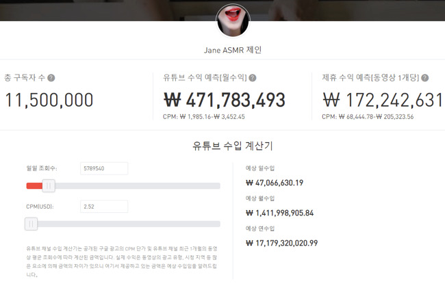 ASMR 유튜버 중 가장 핫하게 떠오르며 1160만 구독자를 보유하고 있는 유튜버 ‘제인’의 수익이 공개가 되어 세간의 큰 관심을 받고 있다.