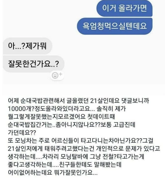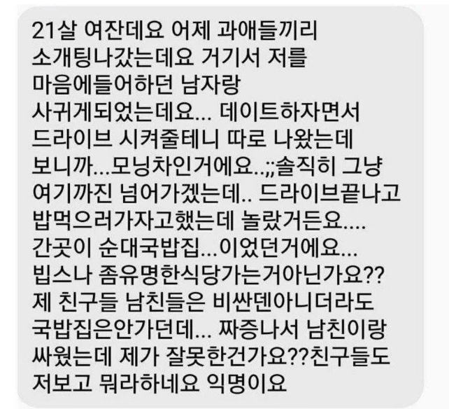 첫 만남에 남자가 ‘모닝’ 끌고 와서 순댓국집까지 데려가서 열받은 여대생의 사연