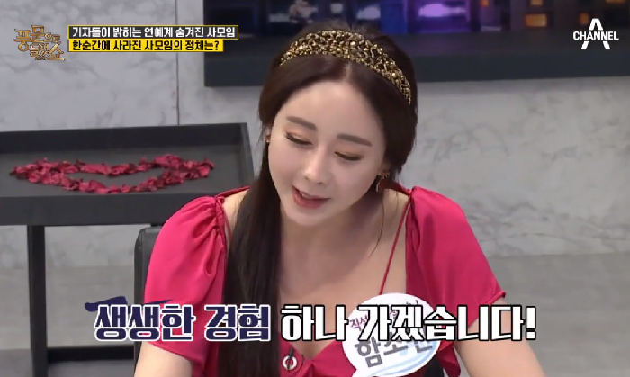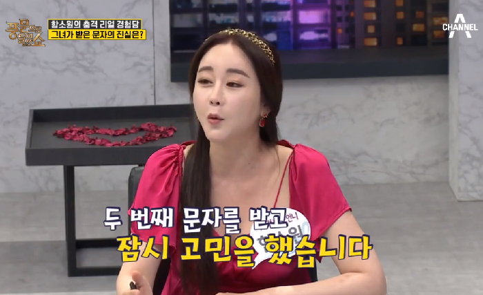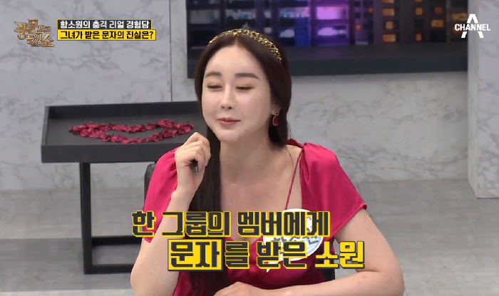 함소원은 “생생한 경험 하나 가겠다”며 “예전에 탑 아이돌 멤버에게 ‘나랑 만날 생각 있느냐’는 내용의 문자를 받았다”고 밝혔다.