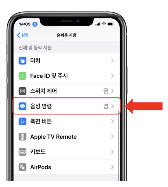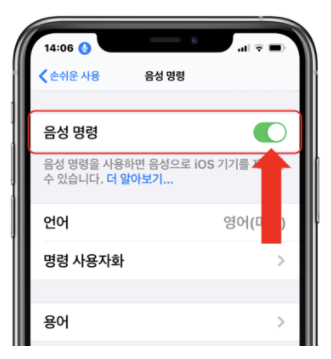 이는 ‘음성인식’ 방법인데, 아이폰의 ‘설정’ 창으로 들어간 후 ‘손쉬운 사용’을 클릭하여 ‘음성 명령’ 창에 들어가면 된다.