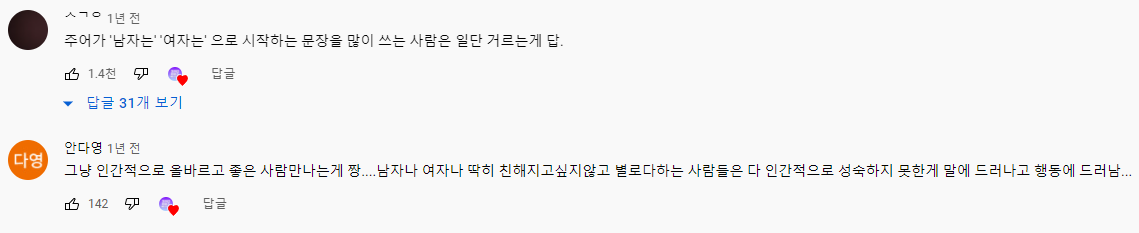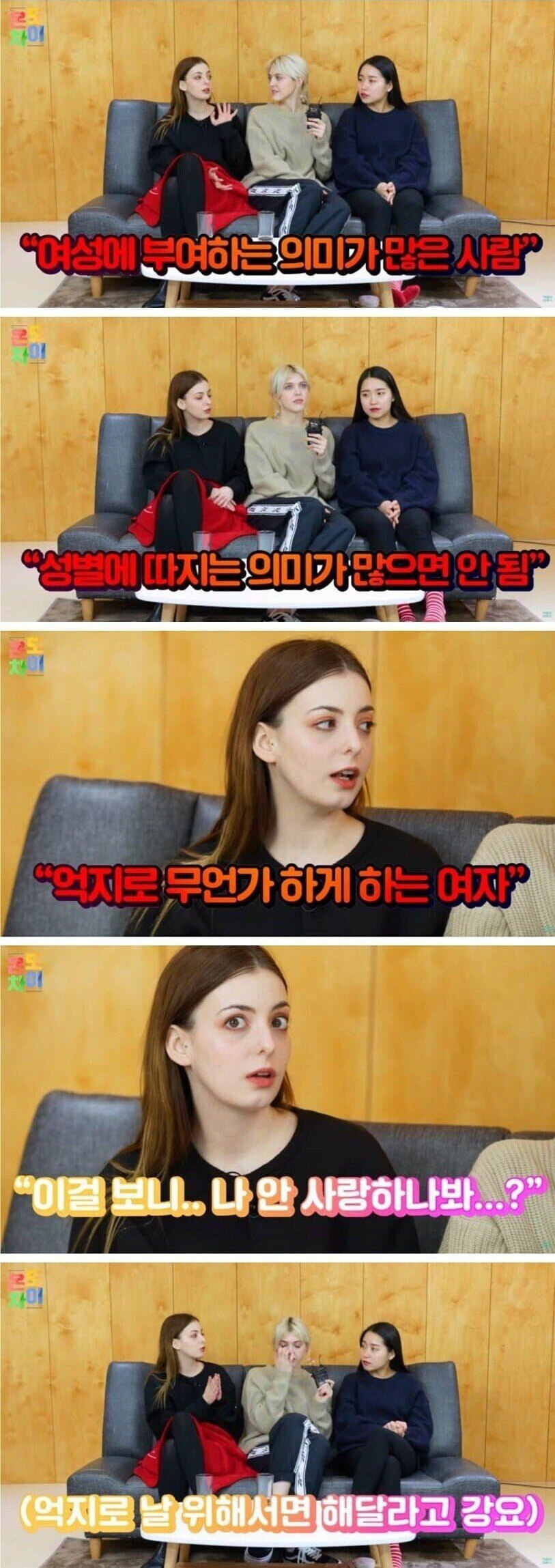 다른 출연진은 “여성에 부여하는 의미가 많은 사람, 성별에 따지는 의미가 많은 사람도 싫다.”라며 설명했다.