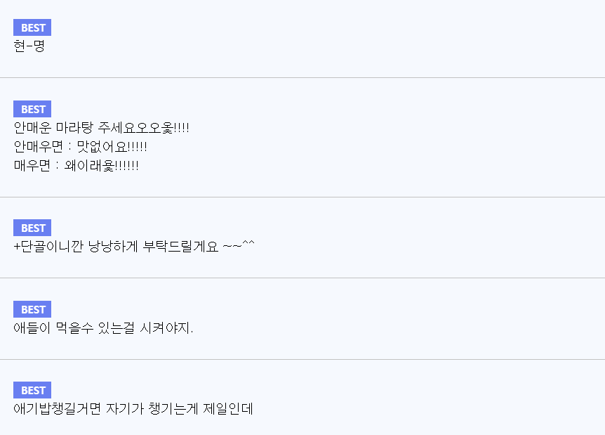 이를 본 온라인 커뮤니티 네티즌들은 “아이들이 먹을 수 있는걸 시켜야지 저렇게 요청하면 사장님 입장에서 난처할 것 같아요.”라는 반응을 보였다.