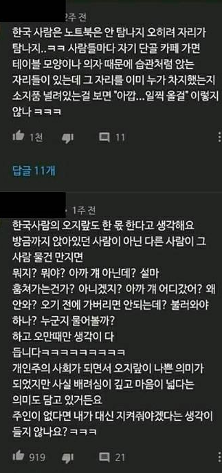 “(저런 인식을 갖게 된 것은)한국인들의 오지랖도 한 몫 한다. 방금까지 앉아 있던 사람이 아니라 다른 사람이 그 사람 물건 만지면 ‘뭐지? 아까 걔 아닌데? 설마 훔쳐가는 건가? 아까 걔 어디갔어? 왜 안와? 오기 전에 가면 안되는데? 불러와야 하나? 누군지 물어볼까?’ 등의 생각을 갖게 된다”,
