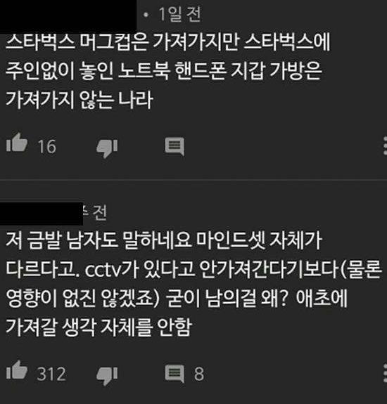 “굳이 남의걸 왜? 애초에 가져갈 생각을 안한다”, “스타벅스 머그컵은 가져가지만 스타벅스에 주인 없이 놓인 노트북, 핸드폰, 지갑, 가방은 안 가져가는 나라” 등의 반응을 보였다.