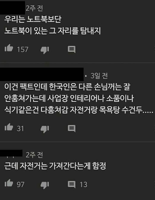 실제 네티즌들은 “한국 사람들은 남의 노트북 탐 안난다. 오히려 자리가 탐난다. 자기 단골 카페 가면 습관처럼 앉는 자리가 있는데 그 자리를 이미 누가 차지하고 있으면 ‘일찍 올 껄..아깝다’라는 생각부터 한다”,