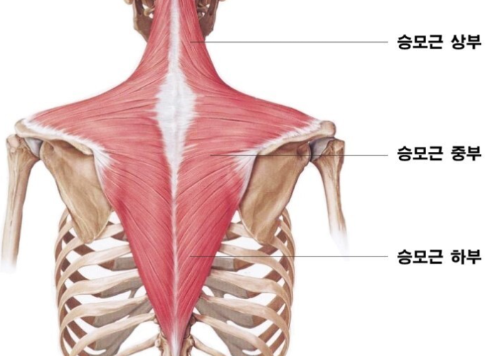 승모근은 등에 있는 근육 중 광배근, 척추기립근과 함께 대표적인 근육 중에 하나이며 면적이 매우 넓어 상부, 중부와 하부로 구성되어 있다.