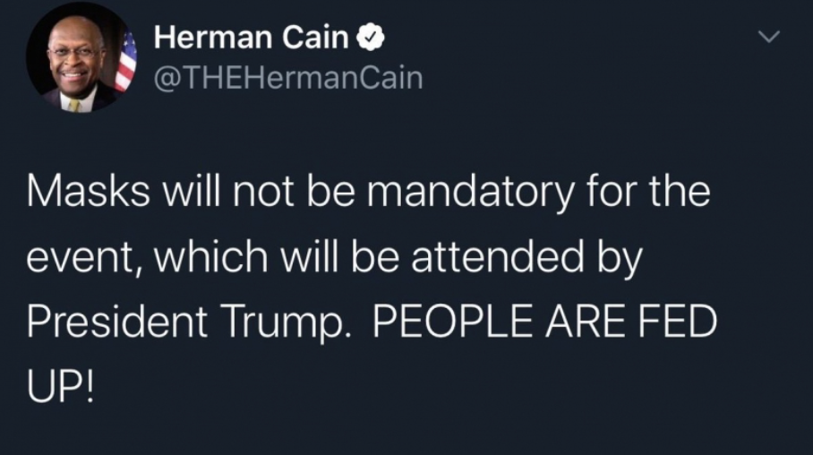 케인은 이전에도 공중보건 전문가들의 권고를 무시하고 마스크 착용을 거부해온 것으로 알려졌다. 그는 마스크를 착용하지 않은 채 다른 참석자들과 인증 사진을 찍고 트위터에 올리기도 했다.