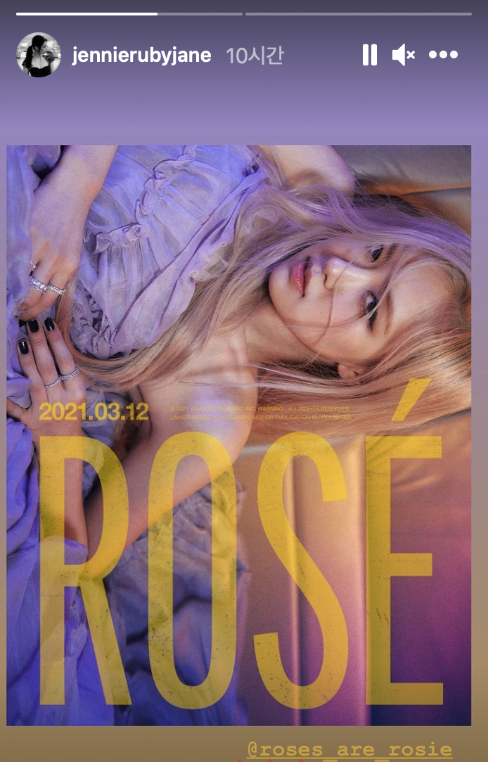 지난 1일 제니는 자신의 인스타그램 스토리에 같은 블랙핑크 멤버 로제의 솔로 데뷔 티저 포스터를 게재했다.