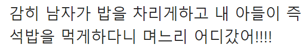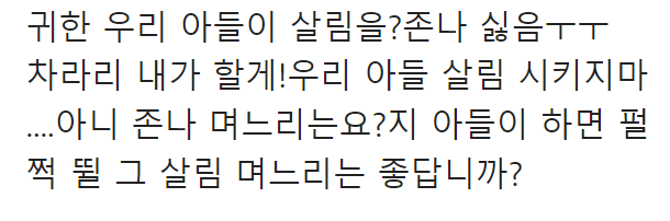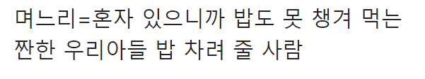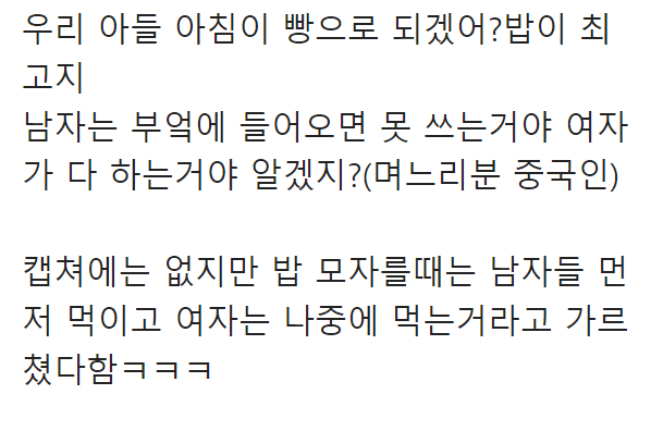 이와 같은 것들을 본 누리꾼들은 아들을 둔 어머니에게 며느리란 자기 아들 밥 잘 차려줄 사람이라며 많은 사람들의 웃음과 공감을 자아내기도 했으며 또한 자기 딸한테 어느 부모가 빨리 결혼해서 좋은 신랑 만나서 밥 안거르고 잘 챙기고 먹을텐데 라는 이야기를 하는 거 본 적 이 있냐는 소리를 하기도 했다.