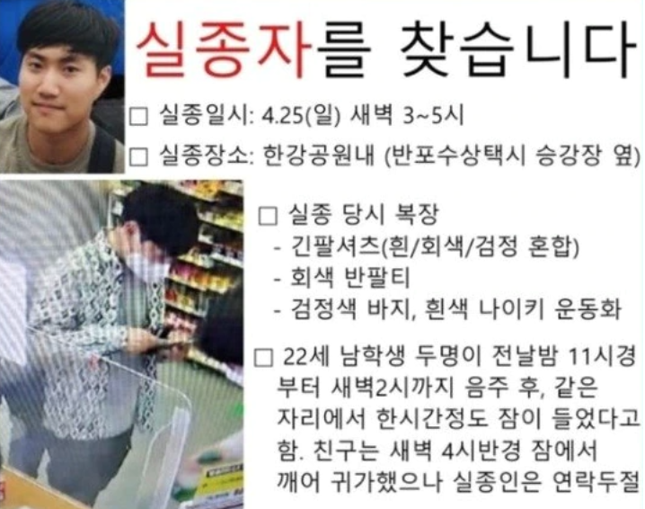 한강공원에서 실종됐던 20대 대학생 숨진 채 발견.