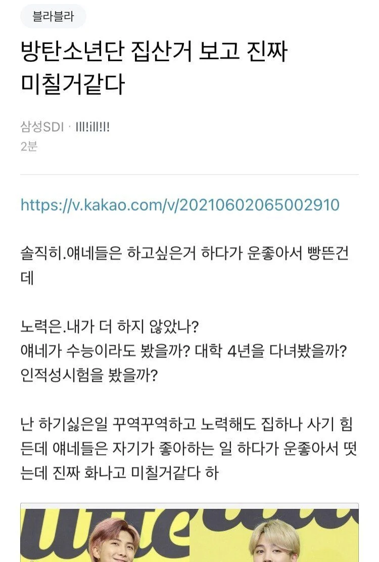 해당 글의 제목은 “방탄소년단 집산거 보고 진짜 미칠거같다” 라는 글이었다.