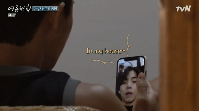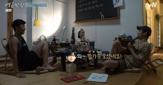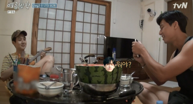24일 밤 방송된 tvN 예능프로그램 ‘여름방학’에서는 박서준이 최우식과 정유미의 쉼터에 놀러온 가운데, BTS 뷔가 영상 통화로 깜짝 출연했다.