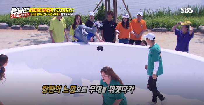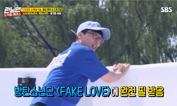 ‘런닝맨’ 유재석이 방탄소년단의 ‘Fake Love’에 맞춰 춤추다가 세트장에서 추락해 웃음을 자아냈다.