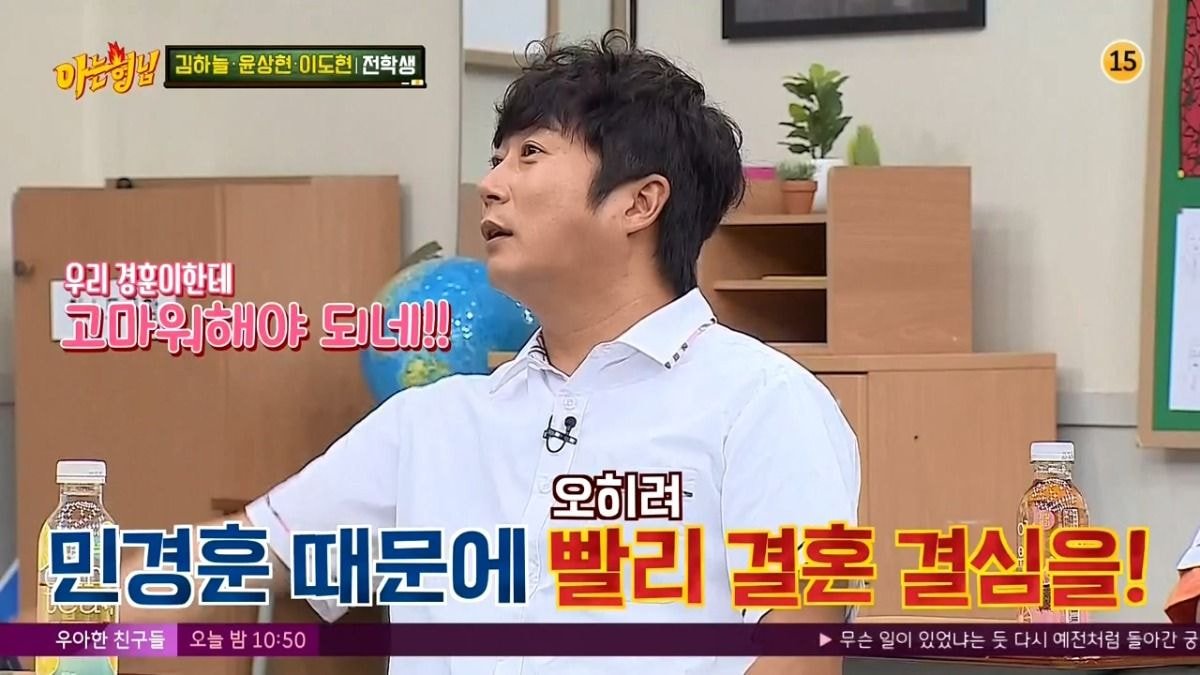 이날 윤상현은 “버즈의 민경훈 때문에 결혼 못 할 뻔 했다”라며 “2014년 브라질로 촬영 가기 전에 당시 여자친구였던 아내 메이비와 살짝 다퉜다. 그 때 ‘이 친구와 결혼을 해야 하나?’라고 9박 10일 내내 생각하다가 귀국해서 술 한잔 하는데 취할수록 전화해야겠다는 생각이 들었다”라며 말문을 열었다.