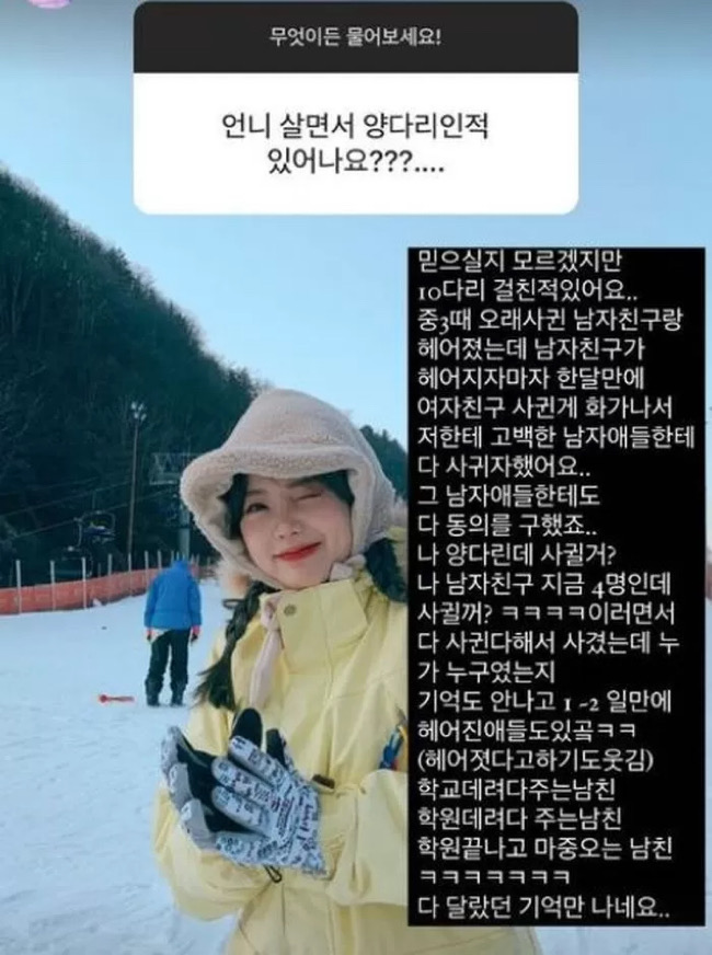 인스타그램에서 한 팬이 “언니 살면서 양다리 해본 적 있어요?”라는 질문을 남기자 이것에 대한 답변으로 “중 3때 오래 사귄 남자친구랑 헤어졌는데 그 친구가 한달만에 바로 애인을 만들었고 이에 화가 나서 10다리를 걸친 적이 있다”라고 말하며 “고백한 남자애들한테 모두 다 사귀자고 이야기했다”고 이야기했다.