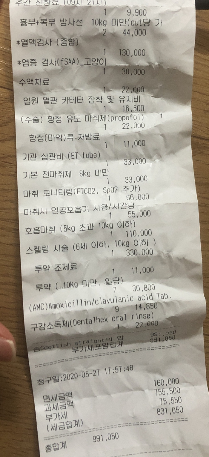한 네티즌이 동물병원에서 고양이 스케일링 치료비로 99만 원을 결제했다고 털어놨다.