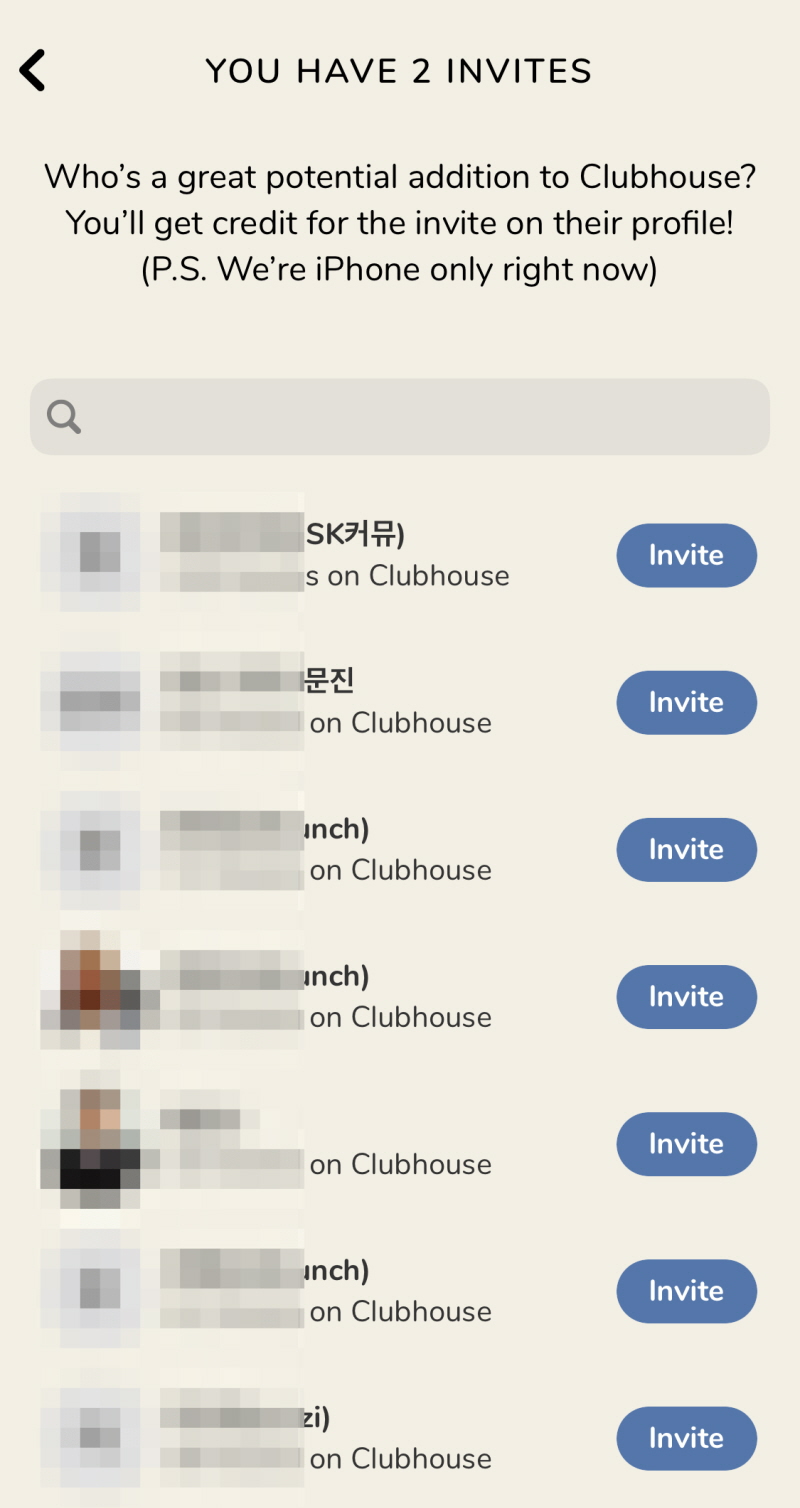 처음 Clubhouse 측에서 셀럽들에게 초대장을 주었고 그 셀럽들로부터 초대장이 점점 퍼져나가고 있다. 따라서 Clubhouse를 사용하는 지인이 없다면 접속할 수 없다는 말이 된다.