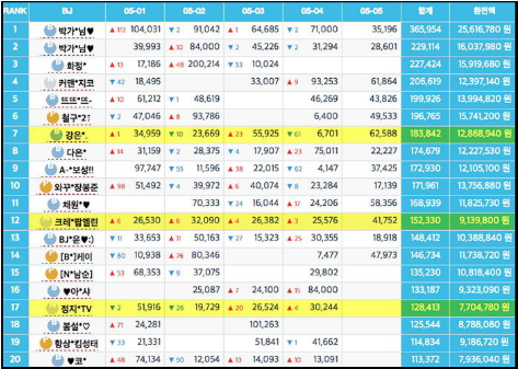 지난 6일 각종 온라인 커뮤니티 및 SNS 상에서 상위권 아프리카 BJ들의 별풍선 합계 내역들이 공개되었다.