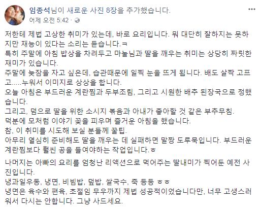 청와대 임종석 비서실장의 음식 솜씨가 온라인 커뮤니티에서 다시 화제가 되고 있다.