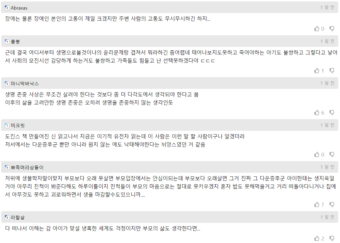 또 “장애를 갖고 태어난다고 해도 자식은 자식입니다. 어떻게 낙태를 할 수 있나요.”라는 반응도 보였다.