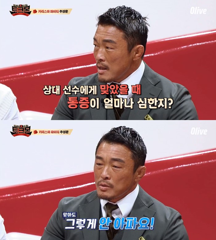 그러자 추성훈은 “경기 중에는 맞아도 안아프다”며 “온몸에 아드레날린이 나와서”라고 대답했다.