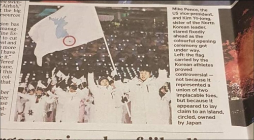 미국 NBC 방송의 ‘한국 비하 망언’이 얼마 지나지 않아 영국 신문은 남북 선수단의 한반도기 사진을 설명하며 “독도는 일본이 소유한 섬”이라는 내용을 보도했다.