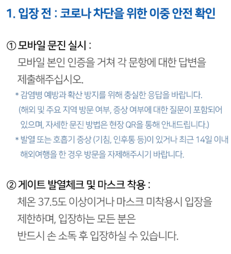 가이드에 의하면, 고갣르은 코로나19 상황이 나아지기 전까지 입장 전 모바일 사전 문진을 거쳐야 한다.