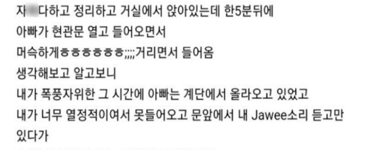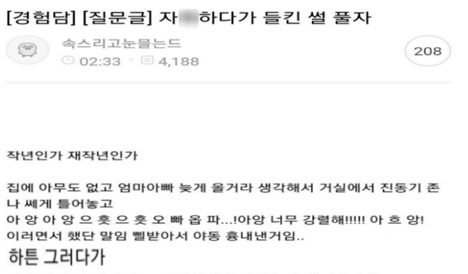 해당 게시글을 올린 작성자 A씨는 “자X하다가 들킨 썰 풀자”라는 제목의 글로 많은 이들의 관심을 끌었다.
