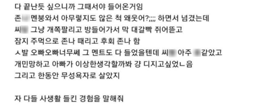 A씨는 너무 민망하고 본인에게 화가 나 자신의 성기를 주먹으로 때리고 후회했다며 글을 마쳤다.