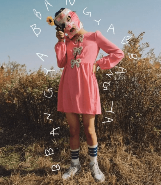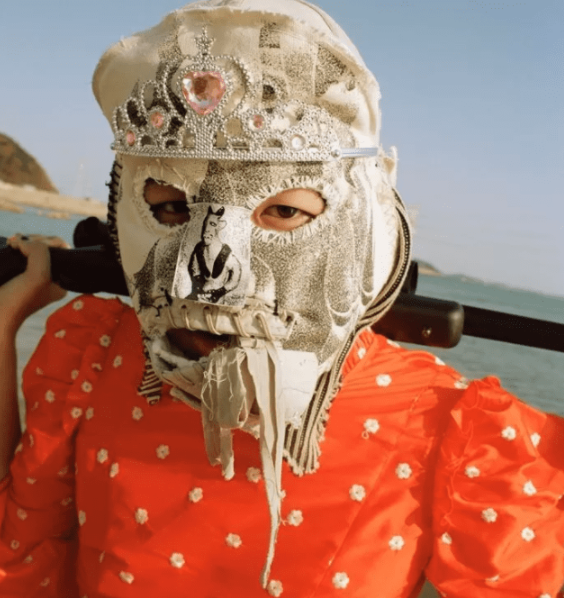 눈과 입을 빼고 얼굴을 가리는 특이한 가면을 쓴 머드 더 스튜던트는 핑크색 왕관까지 쓰며 네티즌들의 시선을 모으며 독특한 패션을 선보였다.