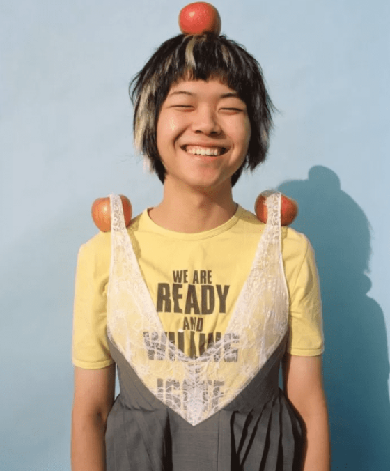 그는 노란색 티셔츠에 레이스가 포인트로 되어있는 뷔스티에 원피스를 코디해서 입었다.