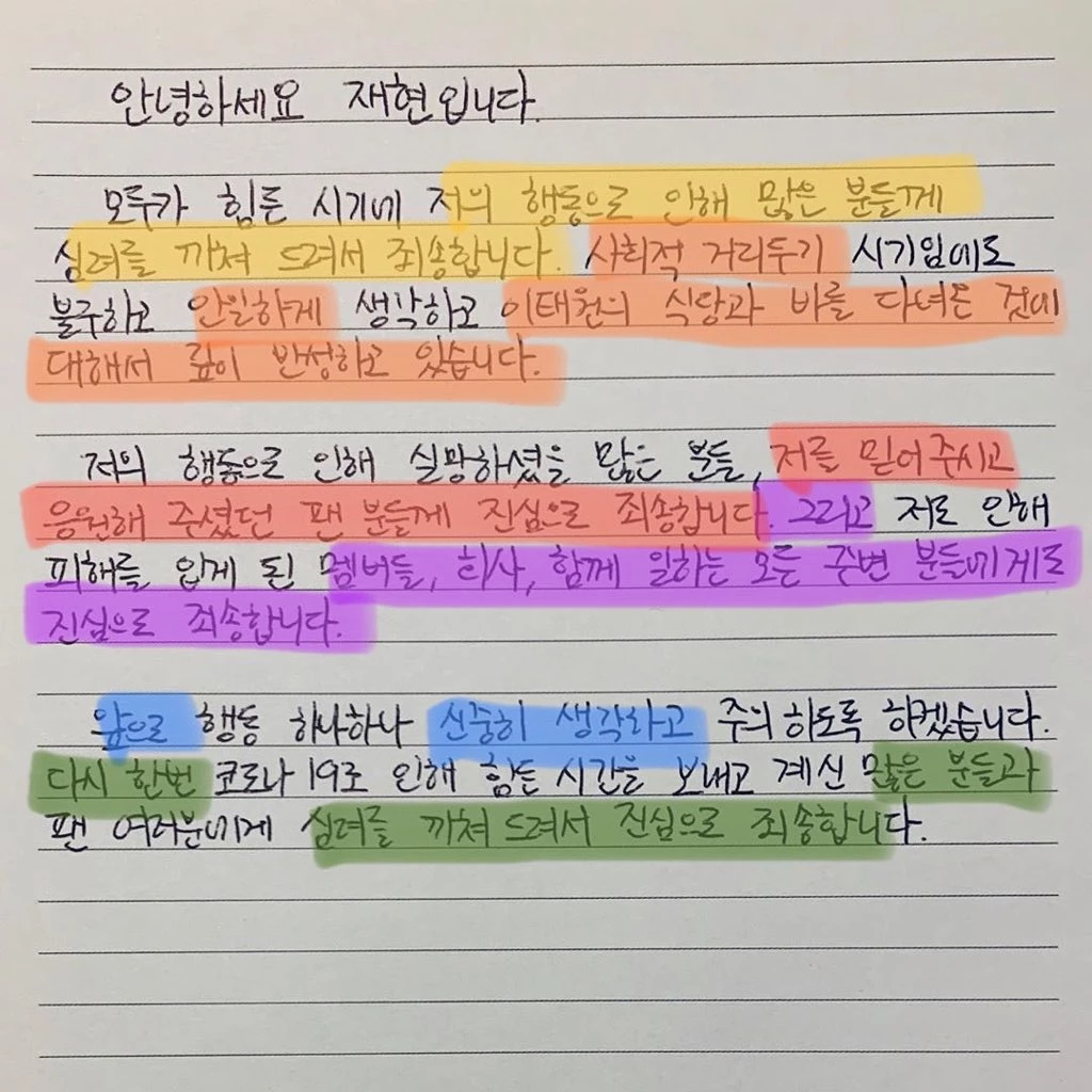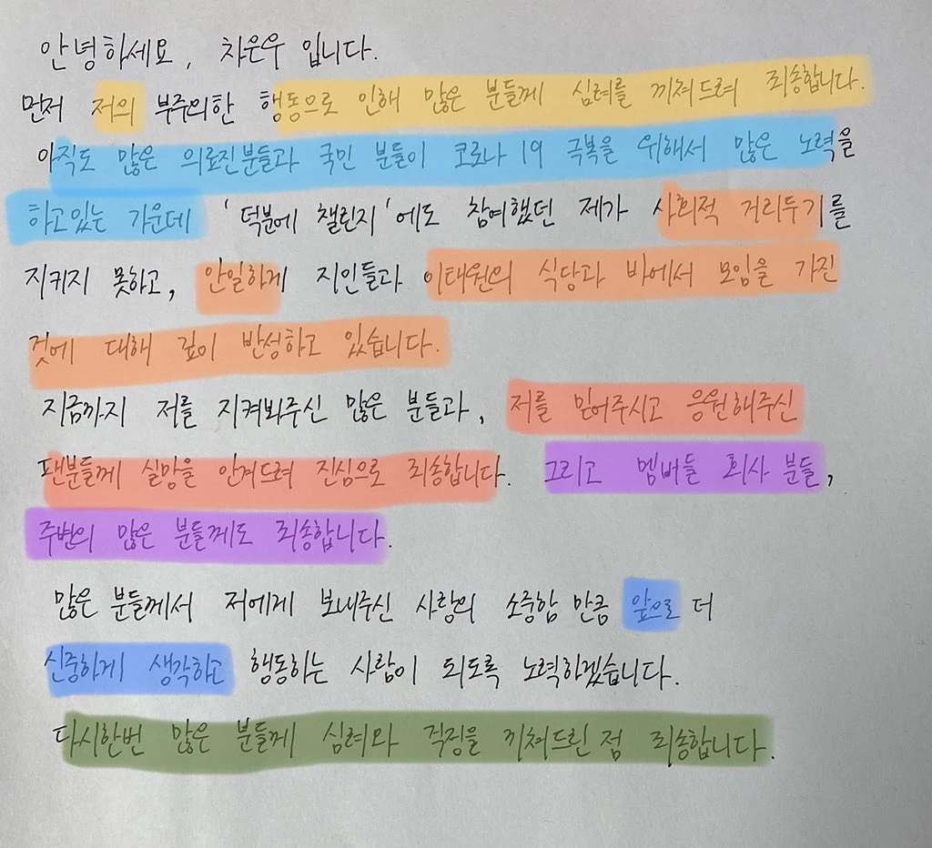 작성자 A씨는 NCT 재현과 아스트로 차은우가 올린 자필 사과문 내용 중 유사해보이는 부분을 형광펜으로 칠해 “인용 수준을 넘어섰다”라며 지적했다.