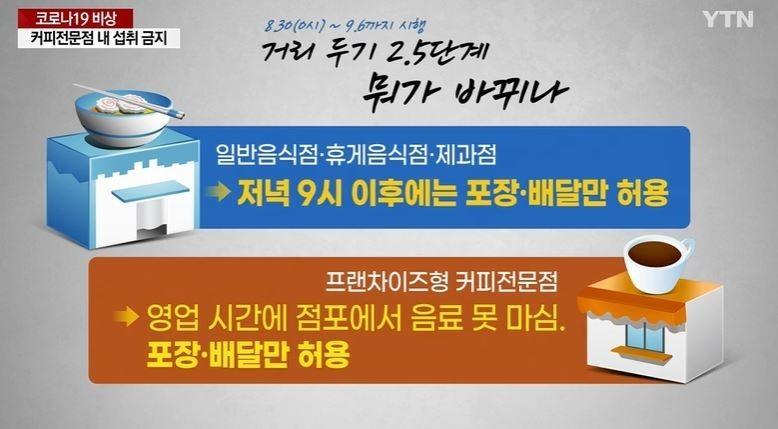 또한 식당, 주점, 호프집, 치킨집, 분식집, 패스트푸드점 등 사람들이 많이 모이고 마스크를 벗어야 하는 곳도 오후 9시 이후로 부터는 포장과 배달만 가능하다.