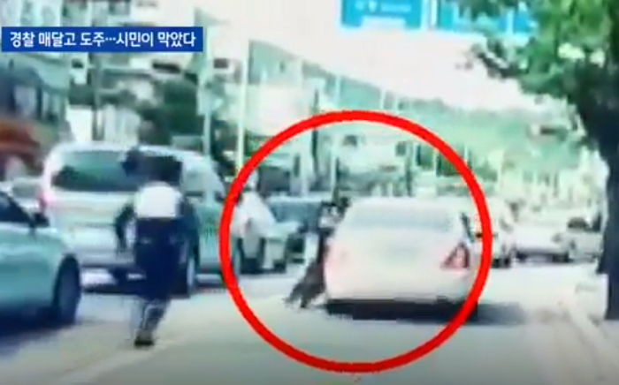 한 시민이 경찰관을 매달고 도주하던 무면허 차량을 자신의 차로 가로막아 범인을 잡고 큰 사고를 막아 화제다.
